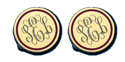 round polished 24 karat gold electroplated cuff links with red epoxy