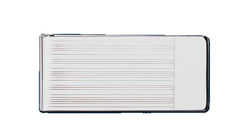 rhodium electroplated money clip with engine turned lines on top and 3/8" engravable bottom