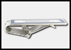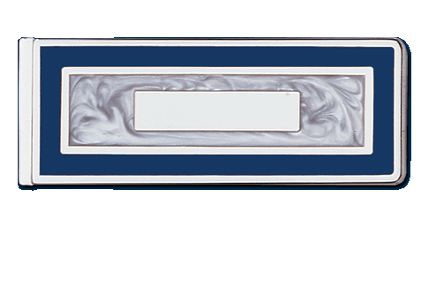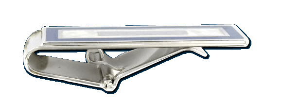 rhodium electroplated hinged money clip with blue and mother of pearl epoxy and polished rectangular center